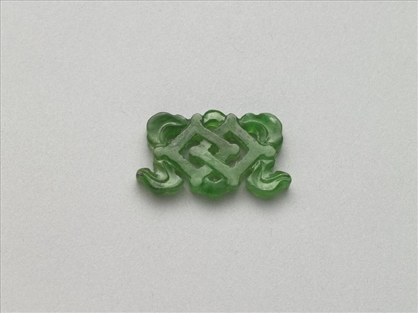 翠玉片狀飾件,全器雕為底襯彩帶的方勝,刀法略粗、似未精細打磨。彩帶由方勝兩側伸展而出,彎折如隨風擺動。
