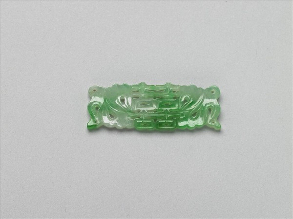 翠玉片狀飾件,全器略成長方片狀,並雕為中央「囍」字、兩側歧出彩帶的對稱樣式。彩帶雕琢為隨風飄動之狀,並利用彩帶飄動所造成的空間,雕鏤為通貫的孔洞,恰可穿繫、固定於他器上,成為製作其他器物的配件。