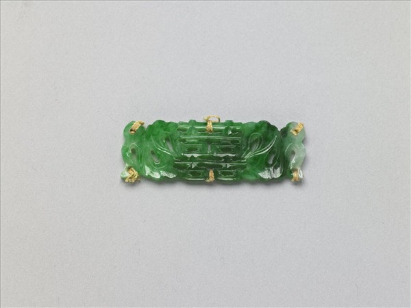 翠玉片狀飾件,全器略成長方片狀,並雕為中央「囍」字、兩側歧出彩帶的對稱樣式。彩帶雕琢為隨風飄動之狀,並利用彩帶飄動所造成的空間,雕鏤為通貫的孔洞,恰可穿繫、固定於他器上,成為製作其他器物的配件。