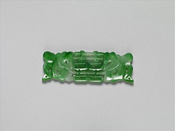 翠玉片狀飾件,全器略成長方片狀,並雕為中央「囍」字、兩側歧出彩帶的對稱樣式。彩帶雕琢為隨風飄動之狀,並利用彩帶飄動所造成的空間,雕鏤為通貫的孔洞,恰可穿繫、固定於他器上,成為製作其他器物的配件。