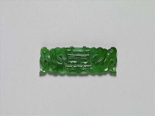 翠玉片狀飾件,全器略成長方片狀,並雕為中央「囍」字、兩側歧出彩帶的對稱樣式。彩帶雕琢為隨風飄動之狀,並利用彩帶飄動所造成的空間,雕鏤為通貫的孔洞,恰可穿繫、固定於他器上,成為製作其他器物的配件。