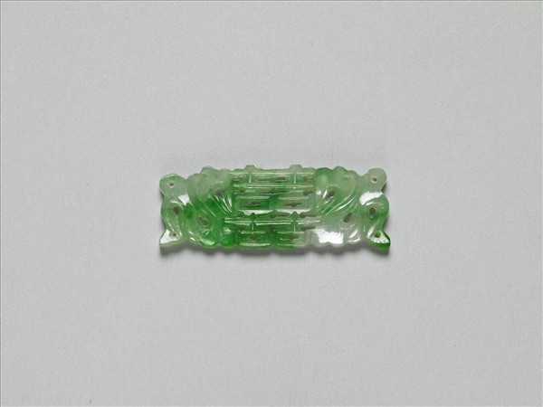 翠玉片狀飾件,全器略成長方片狀,並雕為中央「囍」字、兩側歧出彩帶的對稱樣式。彩帶雕琢為隨風飄動之狀,並利用彩帶飄動所造成的空間,雕鏤為通貫的孔洞,恰可穿繫、固定於他器上,成為製作其他器物的配件。