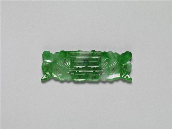 翠玉片狀飾件,全器略成長方片狀,並雕為中央「囍」字、兩側歧出彩帶的對稱樣式。彩帶雕琢為隨風飄動之狀,並利用彩帶飄動所造成的空間,雕鏤為通貫的孔洞,恰可穿繫、固定於他器上,成為製作其他器物的配件。