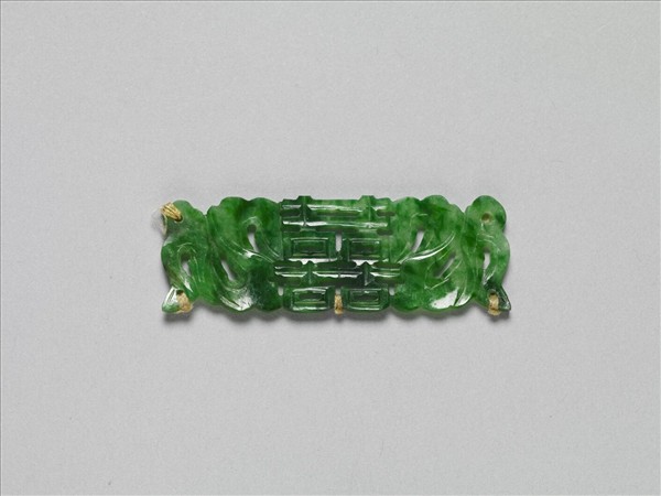 翠玉片狀飾件,全器略成長方片狀,並雕為中央「囍」字、兩側歧出彩帶的對稱樣式。彩帶雕琢為隨風飄動之狀,並利用彩帶飄動所造成的空間,雕鏤為通貫的孔洞,恰可穿繫、固定於他器上,成為製作其他器物的配件。