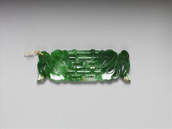 翠玉片狀飾件,全器略成長方片狀,並雕為中央「囍」字、兩側歧出彩帶的對稱樣式。彩帶雕琢為隨風飄動之狀,並利用彩帶飄動所造成的空間,雕鏤為通貫的孔洞,恰可穿繫、固定於他器上,成為製作其他器物的配件。