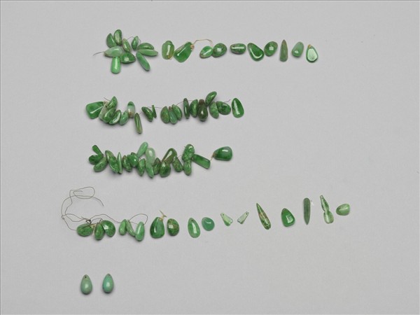 翠玉小飾件七十七個,外型或略近水滴狀、或如卵石,也有如針錐狀,甚至已呈片狀,可知已受過初步的雕琢、成形。其較細之一端有穿,有些還有絲線留存,或許原為製作他器的配件。