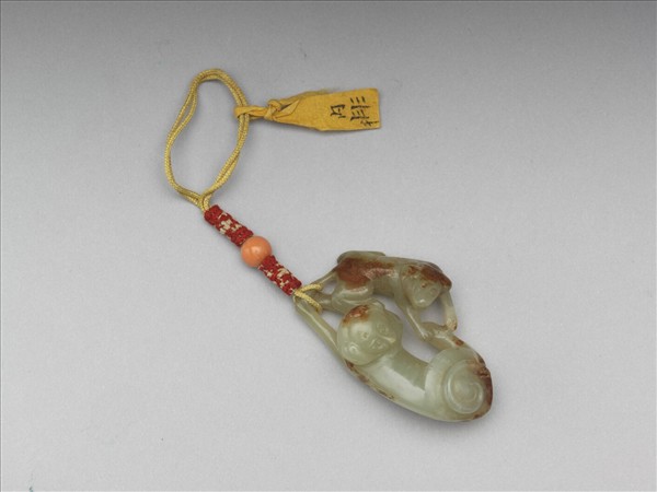 玉質,色青白帶褐色玉皮,雕大小雙犬,兩犬作臥姿,頭尾相接。造形簡練,以數道陰線刻畫肋骨及指爪,首及身軀帶褐色玉皮。大犬前肢交疊處繫結繩及珊瑚珠,以作佩飾。