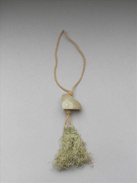 玉質,色青白帶赭斑及裂璺,各面琢捲雲紋。器身中心打穿,繫上結繩及絲穗,作佩飾用。