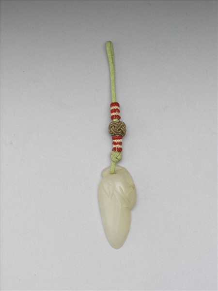 白玉,帶小裂璺,雕作帶葉瓜果形,玉質溫潤。蒂穿一孔,繫結繩以作配飾用。