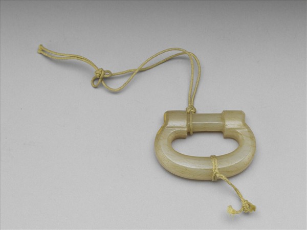 玉質,全器佈滿褐綹絲,雕作帶扣頭,但脫離相關原件,現繫繩作配飾用。