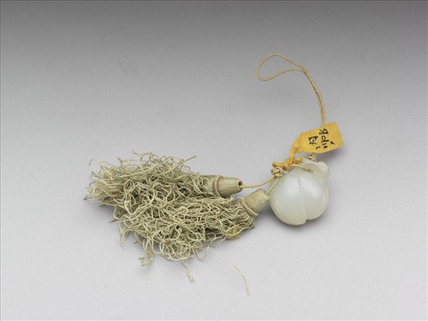 白玉,玉色潔白,帶細璺。雕作桃實形,帶蒂葉,以陰線淺雕桃實凹窩,造型較為扁平。蒂葉間有一小孔,繫繩及絲穗以作佩飾。