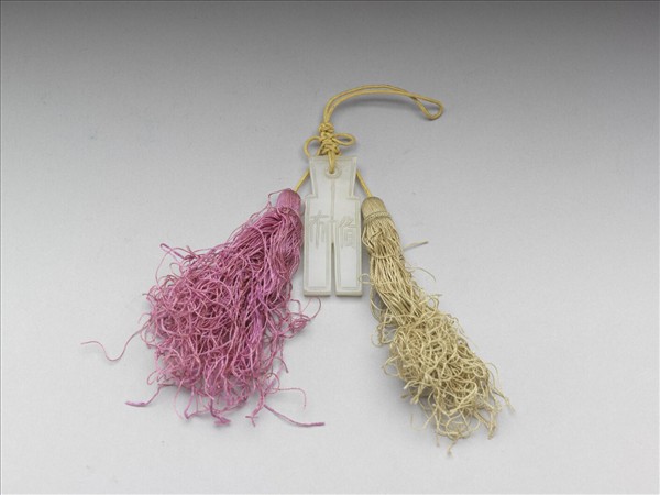 玉質,玉色純淨,帶細璺。雕作方足布幣形,正面於二足上分別刻「貨」、「布」二字,背面則陰刻日、月圖案。布幣為春秋戰國時期流通的一種貨幣,新莽時期進行貨幣改革,復古鑄行各式貨幣,貨布即為其一。本件仿新莽幣的貨布而製,並於穿孔繫結繩絲穗,作佩飾用。