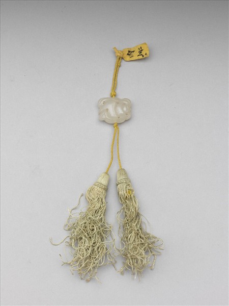 玉質,帶細璺。雕佛教八寶中的法螺,螺身兩旁有飄揚的綬帶,以短陰線刻劃螺殼紋路。從螺身中間直打一長穿,繫繩及絲穗以作佩飾。