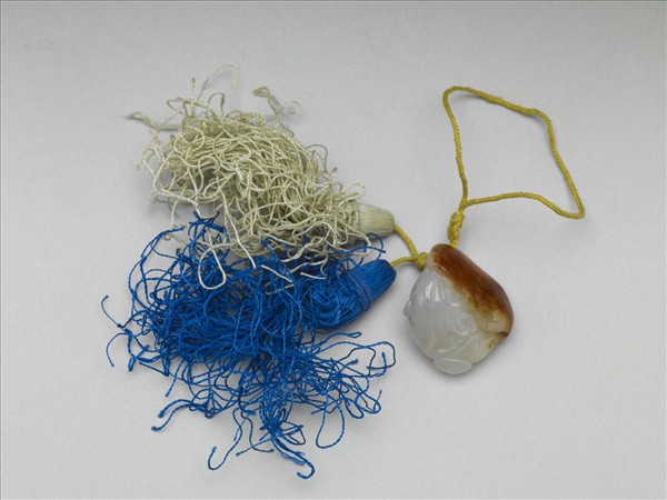 刻紋玉佩飾,一端有穿口,以黃繩繫之,繩末端繫兩絲穗。