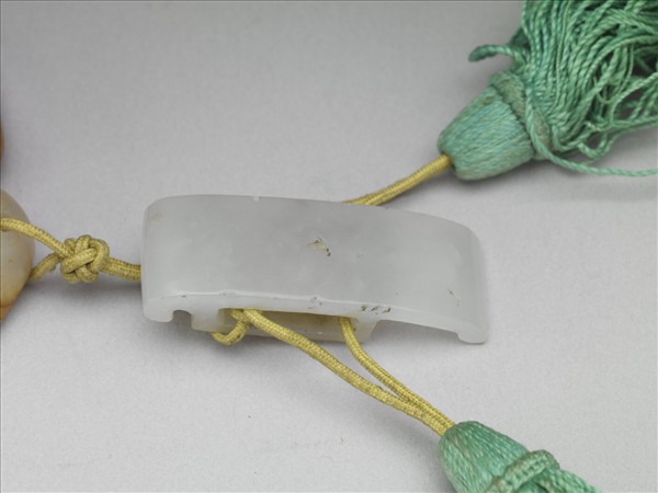 色青白,素面無紋。長方形,繫黃繩及綠絲穗,作佩飾用。