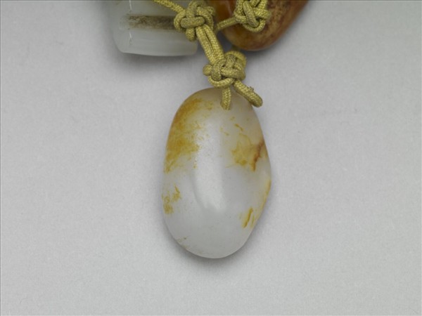 青白籽玉,帶赭色玉斑,璺沁成深褐色,玉質溫潤。頂穿一孔,繫黃繩及綠絲穗,作佩飾用。