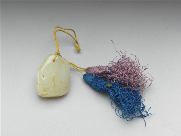 玉質,瑩亮溫潤,帶赭色玉璺,頂部打一穿,繫繩及絲穗,作佩飾用。