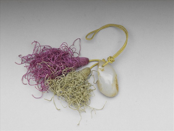 玉質,色青白,帶赭色玉皮。頂部打一穿,繫繩及絲穗以作佩飾。