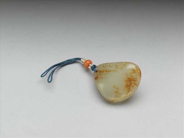 玉質,色青白,帶赭色玉璺。頂部打穿,繫米珠結繩及珊瑚珠,作佩飾用。