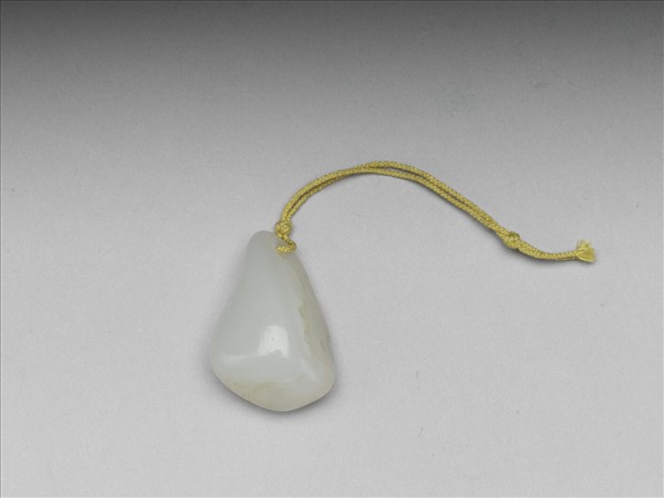 玉質,色白,帶褐色細璺,頂部打穿,繫繩以作佩飾。