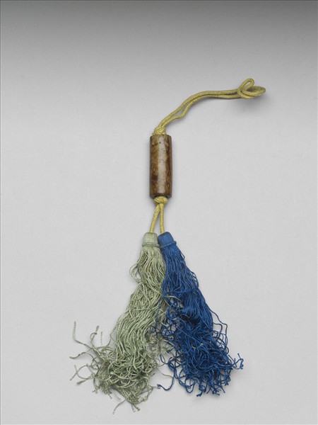 玉管,通體褐色沁染。黃色繫繩穿孔,下端繫綠色、靛色絲穗。