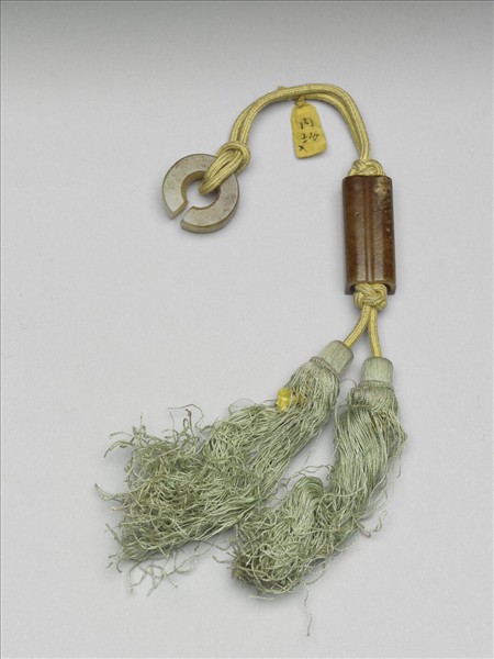 玦形飾件、玉管繫以黃繩,下端繫兩綠絲穗。