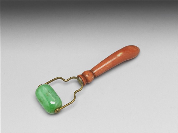 珊瑚柄,柄前端接金屬架,架端固定長棗形翠綠玉珠,可來回滾動,作按摩用具。