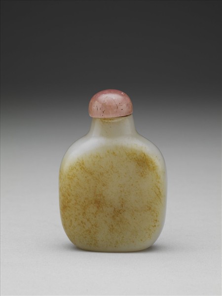 玉質,短頸,弧肩,扁平形方圓壺身,帶粉色碧璽蓋及牙匙。器身一面滿布淺褐玉綹,另面光素無紋,僅底部有一道褐色玉璺。