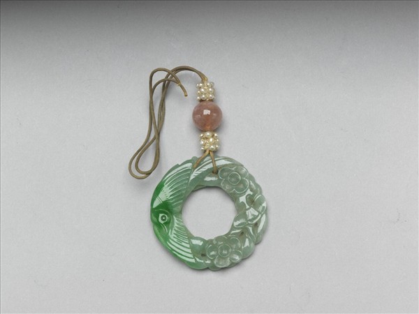 玉質,利用翠玉原色層次,於環上巧雕展翅喜鵲及折枝梅花,寓意「喜上眉梢」。鏤空處繫米珠結繩及粉色碧璽,作佩飾用。