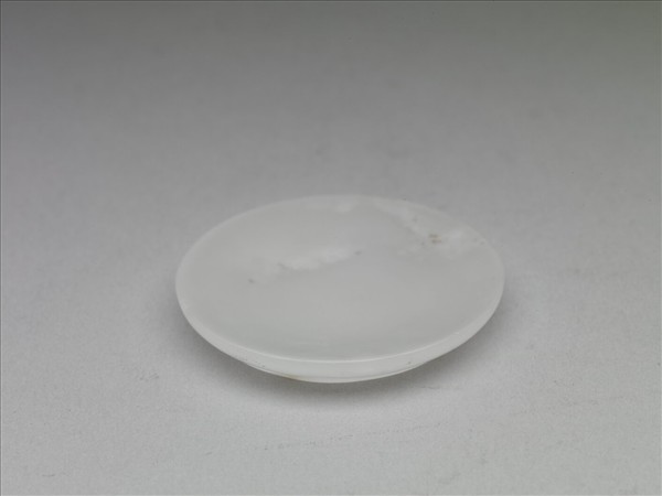白玉煙碟,質地溫潤,帶玉綹。碟面微凹,帶圈足,素面無紋,為清代放置鼻煙粉的小碟。