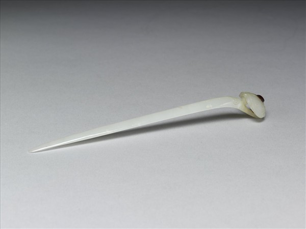 玉質,扁長體,末端漸收呈扁圓形。簪首雕如意雲頭式,簪面周沿琢陰地如意雲紋環飾,中央刻陰線一圈,內鑲嵌紅色寶石一塊。挺身自簪頂下收束,於弧折後寬直漸收,基部挺面飾一如意雲頭紋。整器玉色潤澤白淨,帶些許淺褐色結晶斑。