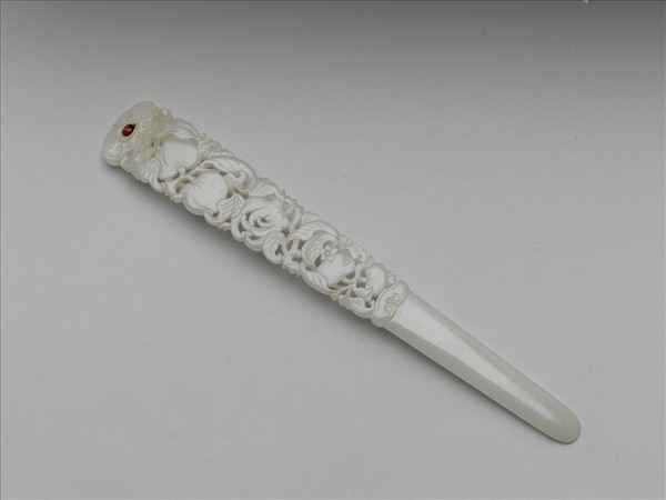 扁簪,白玉質。整器為豆瓣形制,依其紋理可分作上下兩段。簪身筆直,簪首頂部微外折,琢如意雲式,中央鑲嵌紅色寶石一件。上段簪面以鏤雕及淺浮雕技法往下依次作蝙蝠、蟠桃、佛手與石榴花葉等傳統吉祥紋樣,簪柄基部面陰刻如意雲紋,下接素挺,尾端微斂,背面平整。整器以陰刻表現細部紋飾,作工細膩,玉色青白潤淨,有綹。此器與院藏故玉7752為一對。