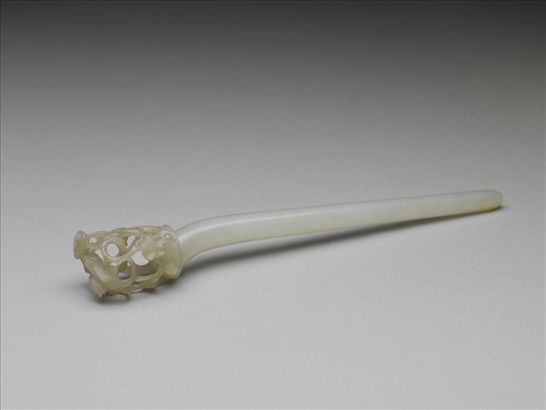 髮簪,白玉質,玉色瑩潤有光澤。整器作長形圓錐狀。簪首鏤雕喜上眉梢有喜鵲一對,一展翅停在梅花之上,一回首歇立於枝頭,意寓「喜上眉梢」。挺身自冠沿下收束,於近簪首處作淺弧折後漸收。直素挺,末端圓。有綹有傷。