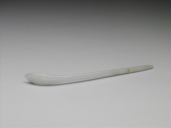 髮簪,玉質,玉色白有微瑕,帶黃褐色疵斑。整器作長形圓錐狀,簪首形似未展開的花苞,面刻數道陰線紋,簪身淺弧折處以淺浮雕飾如意雲紋。直素挺,末端尖。有綹有傷。