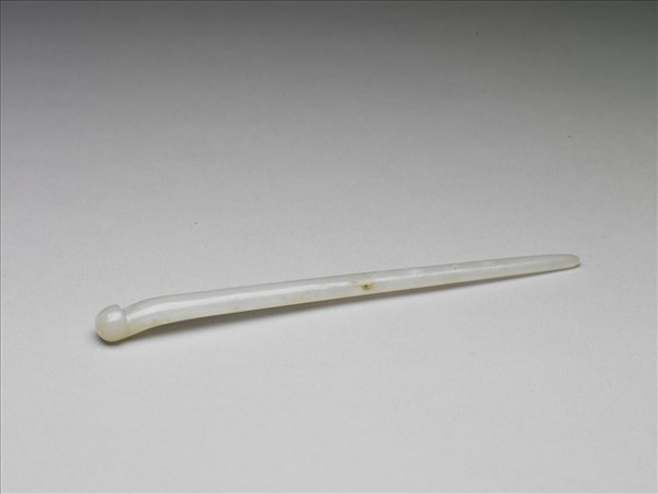 髮簪,玉質,玉色白有微瑕,帶黃褐色疵斑。整器作長形圓錐狀,簪首琢半圓鈕,挺身自冠沿下收束,於近簪首處作淺弧折後漸收。直素挺,末端圓。