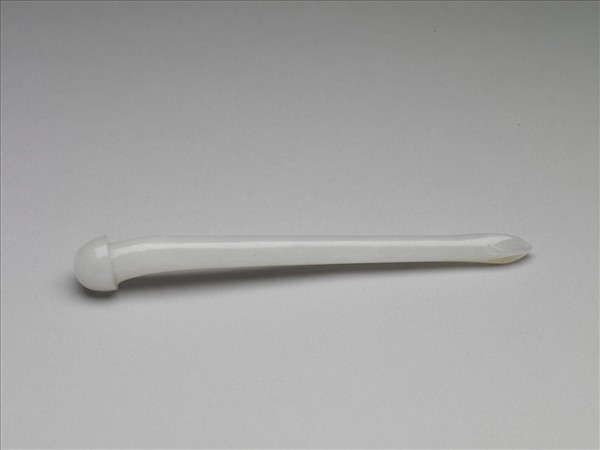 髮簪,玉質,玉色白而柔潤。整器作長形圓錐狀,簪首琢半圓鈕,挺身自冠沿下收束,於近簪首處作淺弧折後漸收,柄尾鑿成萼瓣狀,末端尖。