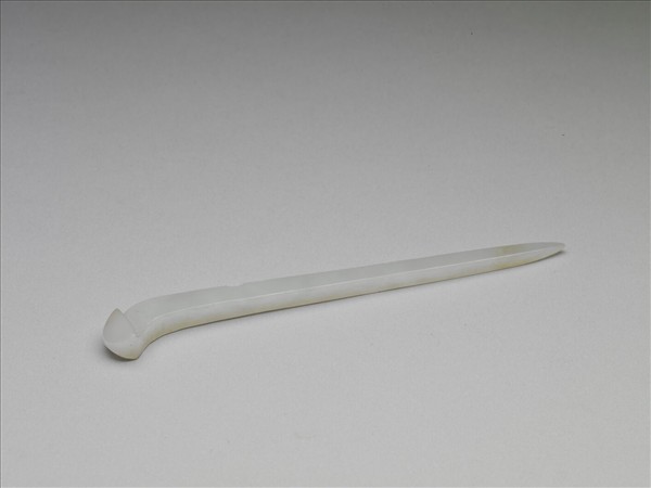 素挺簪,玉質,玉色白而柔和。簪挺略扁,簪頂下折呈鈎狀,直長的器身至簪首處略微彎弧,末端尖。器身光素無紋,有綹。