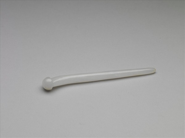 髮簪,玉質,玉色瑩白晶潤。器作長形圓錐狀。簪首琢半圓鈕冠,挺身自冠沿下收束,於近簪首處作淺弧折後漸收,直素挺,末端圓。全器光素無紋,有綹。