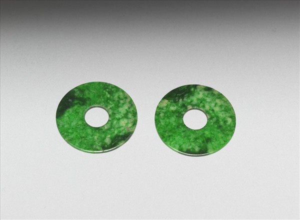 耳環一對,翠玉質,玉色瑩亮翠綠,滿佈深淺綠色塊斑,間雜少許冰糖狀結晶斑。器作環形,外型皆如玉壁,壁面平,均有綹,表面有刮痕。