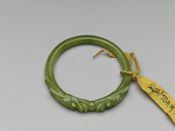 環形玉鐲,玉色呈草綠色。外壁浮雕雙龍首,作搶珠狀,龍身相接而成器。