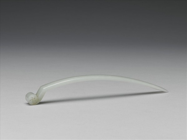 髮簪,玉色青白,溫潤有光澤。器作扁長形,簪首下折,簪頂作卷軸狀,兩側邊以陰線刻花,挺身彎弧。器身光素,末端圓。