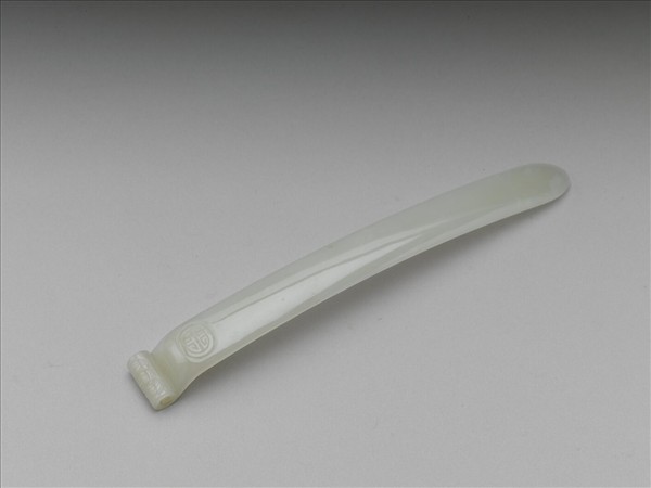 髮簪,玉色潤白。器作扁弧長形,簪首下折,作卷軸狀,頂面以陰線琢蝙蝠紋。簪挺折曲面飾團壽字紋,挺身彎弧,末端圓。