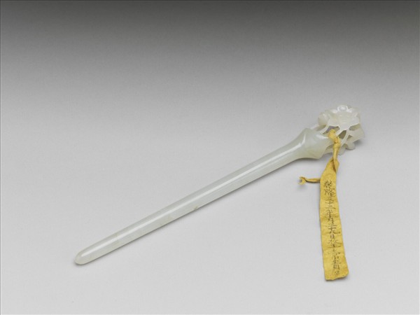 全器為細長棒狀,簪首鏤雕梅花枝葉,互相延伸捲繞,長棒可簪髮。