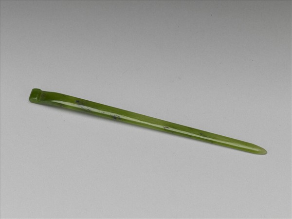 色青,玉質勻淨,扁長形,形如扁方,尺寸較小。全器光素無紋,僅在末端簪首處下折後回卷。是一件取法扁方造型的髮簪。