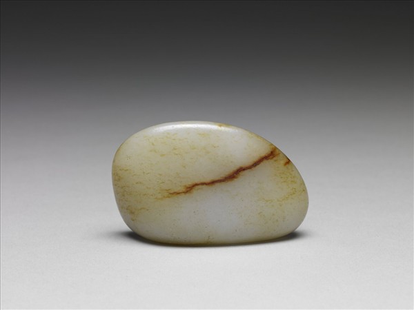 玉質,帶褐色沁。全器呈一不規則橢圓形玉,邊緣平整光滑,表面光素無紋。