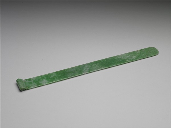 翠玉扁方,長而扁平,一端下折後捲起成五瓣小花形,一端圓弧收尾。玉色圓潤,柄身光素無紋。扁方是婦女的髮髻頭飾,婦女在梳髮髻時,將頭髮纏繞於扁方上,作為一橫髻,便能固定,因此扁方均作扁平一字型。