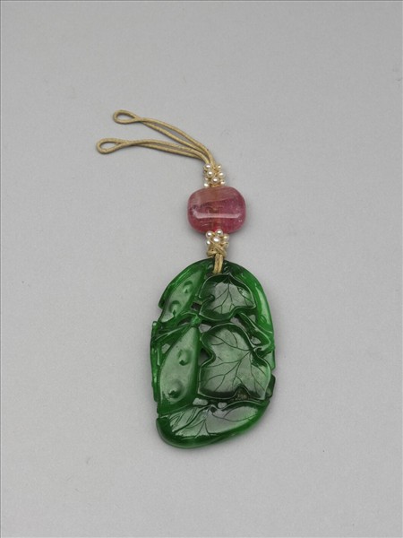 兩面均雕豆莢、捲鬚和莖葉,紋飾略有不同,上繫黃縧,貫飾粉紅碧璽及米珠。