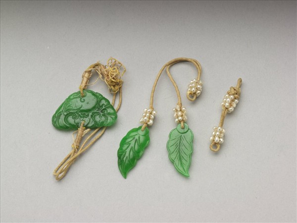 葉形玉長2.2公分 寬0.9公分;綠玉牌寬2.5公分 高1.6公分