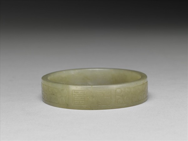 玉鐲,鐲面淺浮雕「福」、「壽」二字,其餘飾以淺浮雕如意雲紋。
