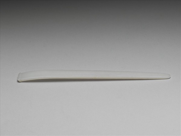 玉質,直長的器身至簪首處略略彎弧,器身光素,玉色柔和。
